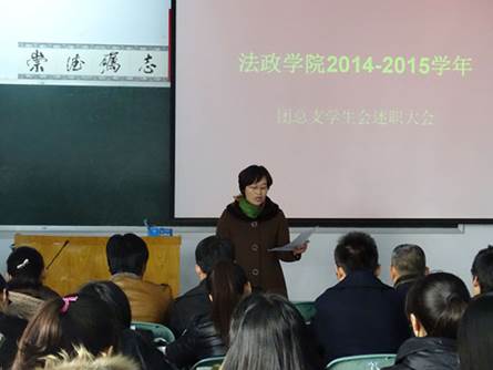 为切实进一步提高学生干部素质,加强学生干部队伍建设,12月21日上午八时,法政学院团总支学生会述职报告大会在C-102教室顺利举行。法政学院党总支书记崔秀花教授、党总支副书记王彦老师,团总支书记黄春建老师、各级辅